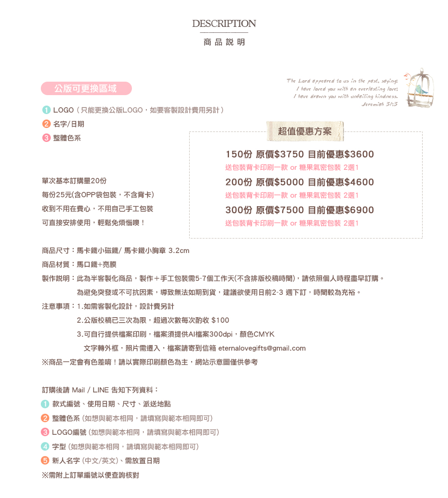 ☑ 需增加內容或變更原設計元素依修改程度報價(如客製LOGO,圖案,排版方式等)