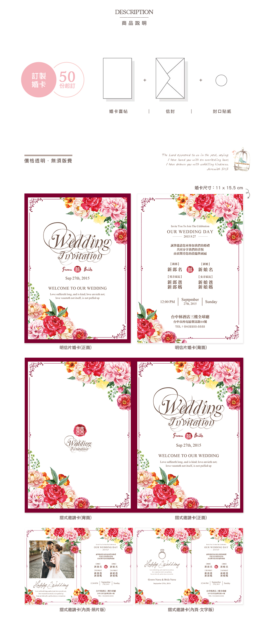 訂製明信片婚卡喜帖.編號CH01a 尊爵牡丹 胭脂紅.喜帖婚卡.贈信封及貼紙.喜帖免版費.少量喜帖印製.婚禮邀請卡 ╭*EternaLove