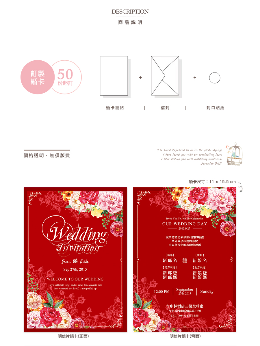 訂製明信片婚卡喜帖.編號CH01b 尊爵牡丹 胭脂紅.喜帖婚卡.贈信封及貼紙.喜帖免版費.少量喜帖印製.婚禮邀請卡 ╭*EternaLove