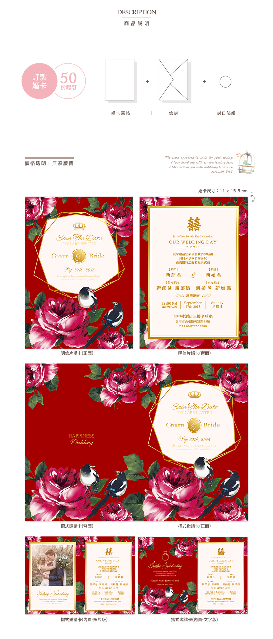 訂製明信片婚卡喜帖.編號CH07 喜鵲報喜 胭脂紅.喜帖婚卡.贈信封及貼紙.喜帖免版費.少量喜帖印製.婚禮邀請卡 ╭*EternaLove