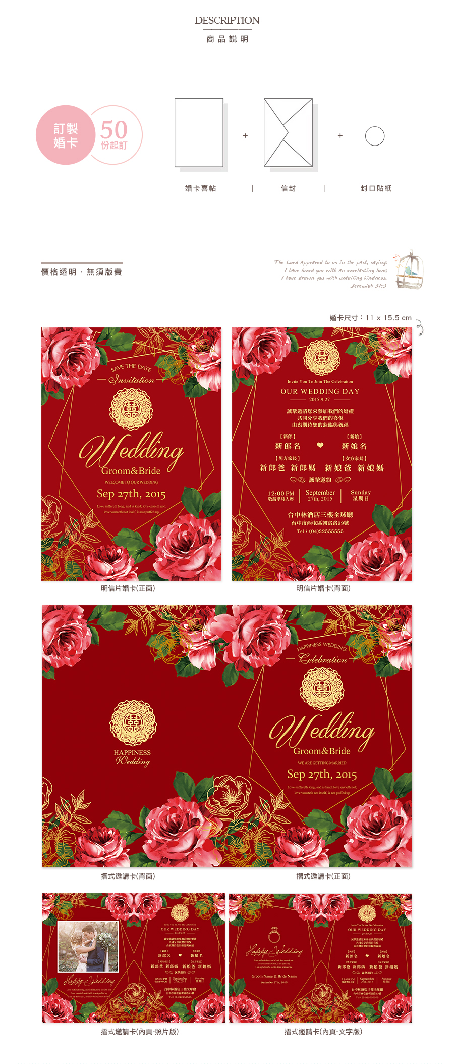 訂製明信片婚卡喜帖.編號CH10 花開富貴 花魁紅.喜帖婚卡.贈信封及貼紙.喜帖免版費.少量喜帖印製.婚禮邀請卡 ╭*EternaLove