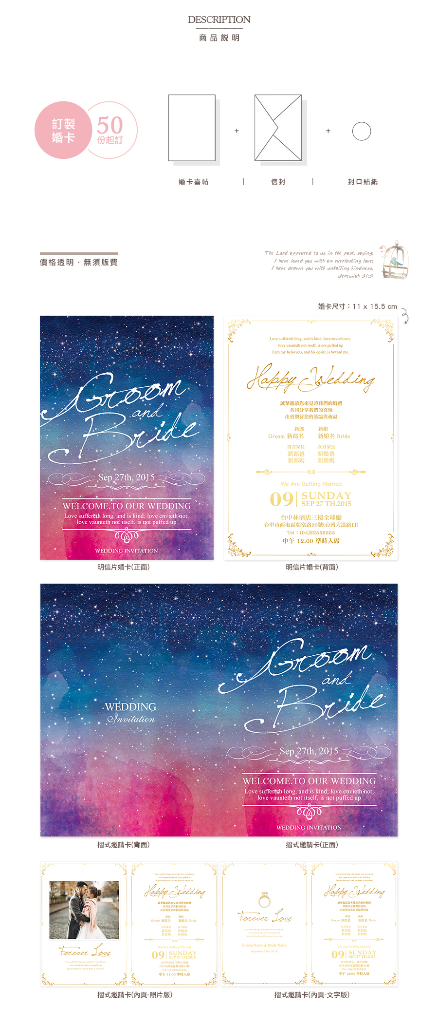 ☑ 可修改新人名字、宴客資訊及修改整體色系,不另酌收修改費