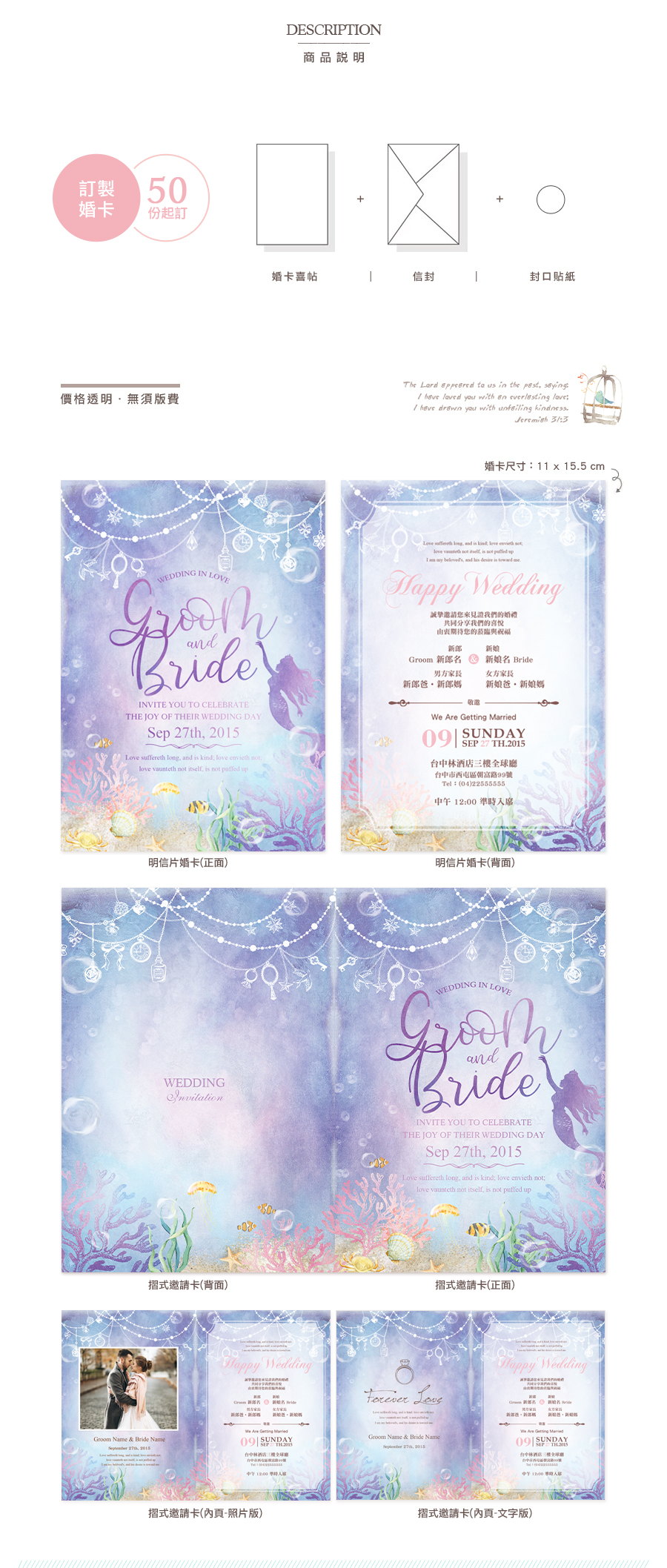 訂製明信片婚卡喜帖.編號MR17 海底之心 海洋藍.人魚公主 美人魚 喜帖婚卡.贈信封及貼紙.喜帖免版費.少量喜帖印製.婚禮邀請卡 ╭*EternaLove